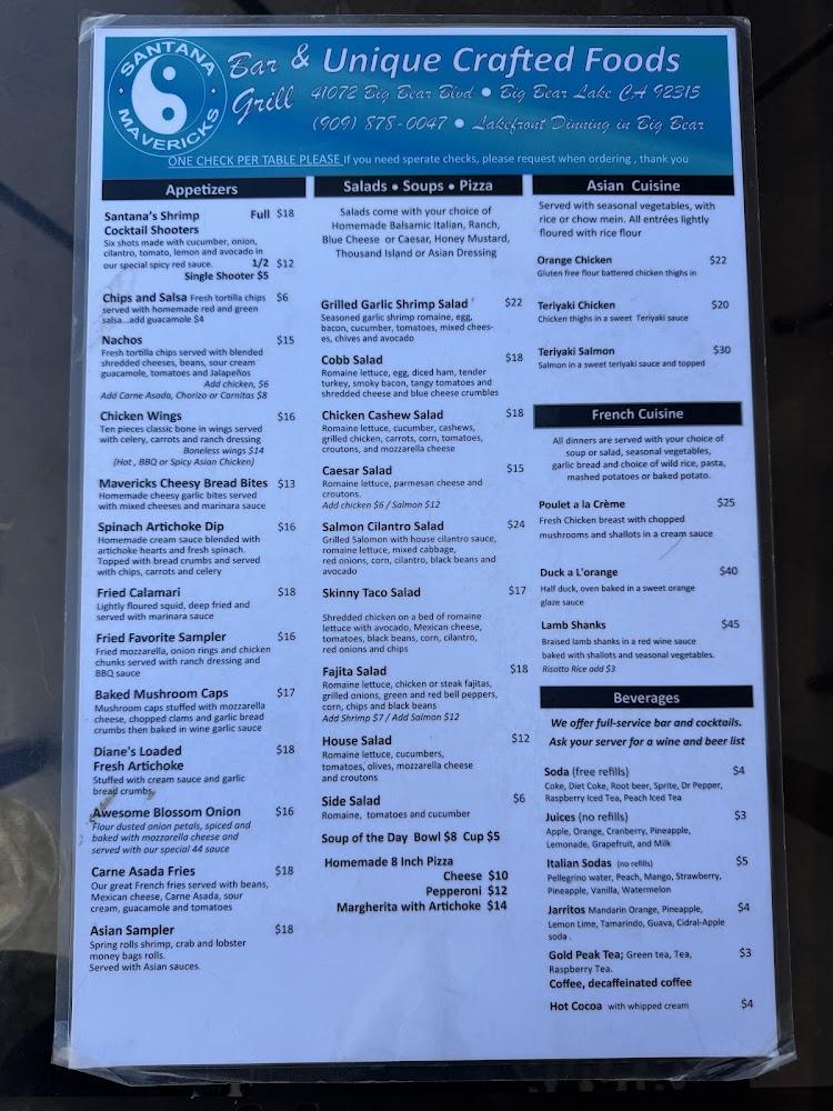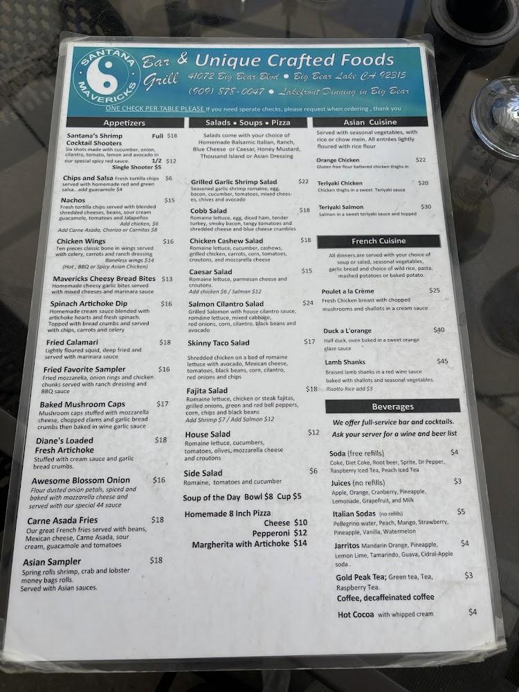 Welcome to Santana Mavericks Bar N Grill, your ultimate destination for delicious grilled cuisine in Big Bear Lake. Located at 41072 Big Bear Blvd, our vibrant eatery offers a diverse menu featuring local specialties, vegetarian options, and delightful small plates perfect for sharing. Enjoy our excellent cocktails and extensive beer selection while you unwind on our spacious terrace. Whether you’re joining us for breakfast, lunch, or dinner, our quick service and inviting atmosphere make it ideal for solo diners or groups. Plus, with wheelchair accessibility and happy hour specials, Santana Mavericks is the perfect spot to relax and savor every bite!